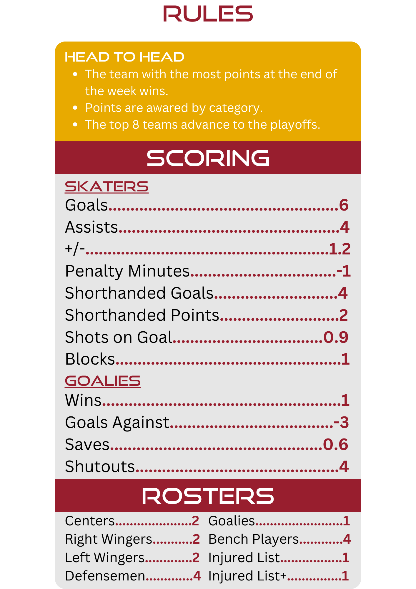 The Maryland All-Stars fantasy hockey league is proud to announce the rules and scoring system for the upcoming 2024 season.