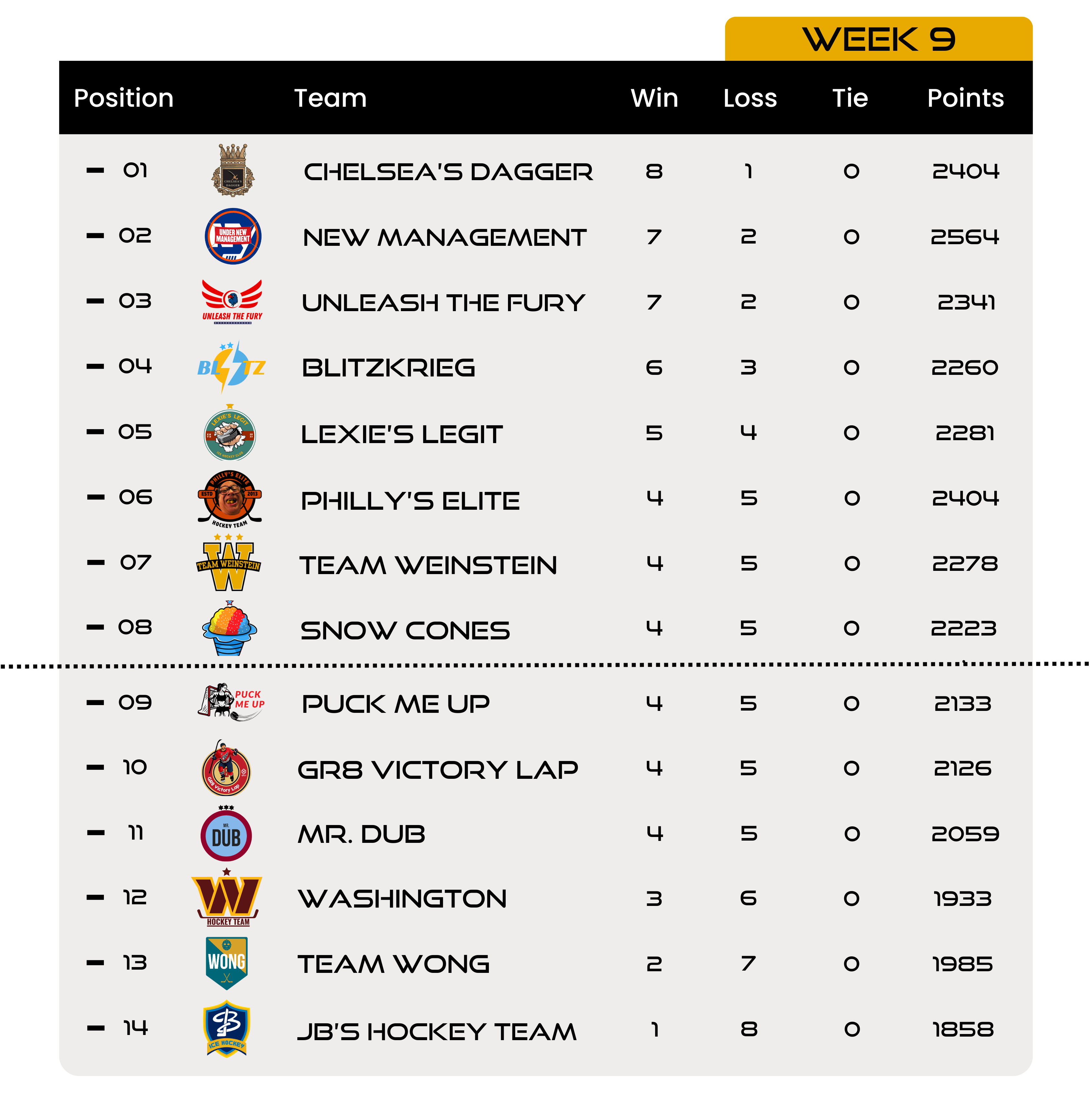 Here are the full standings after nine weeks of play: