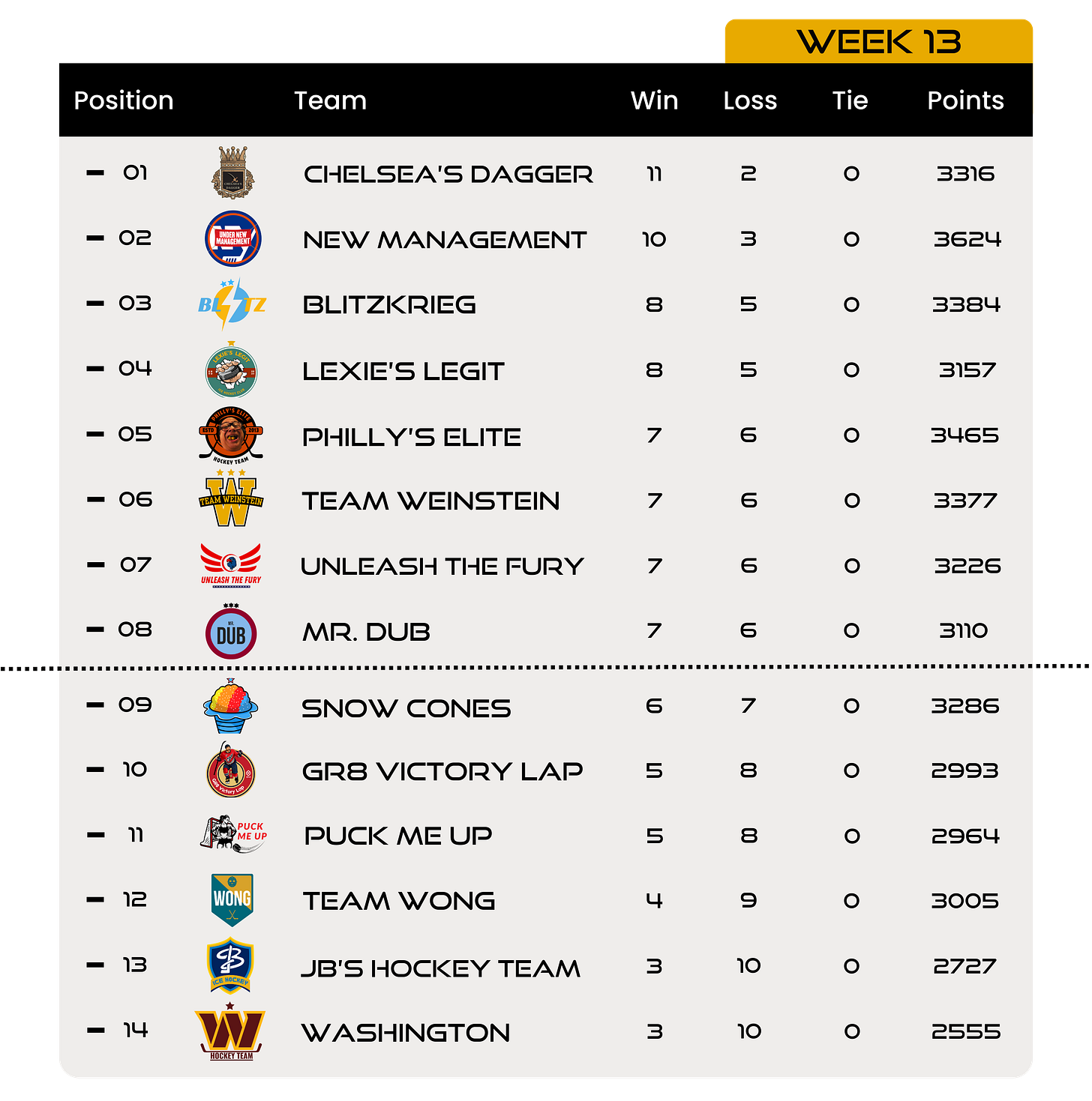 Team Weinstein, Mr. Dub, and Chelsea’s Dagger also took care of business this week, ensuring all teams in the playoff positions are over .500.