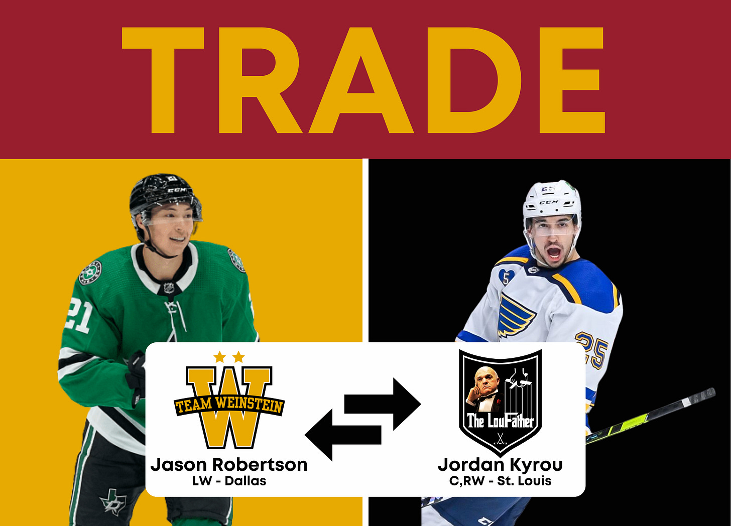 NewsBREAKING: Robertson traded for KyrouTeam Weinstein and Lou’s Still Clueless have agreed to terms on swap deal.Jan 29, 2025ShareTeam Weinstein and Lou’s Still Clueless have agreed to trade St. Louis Blues C,RW Jordan Kyrou in exchange for Dallas Stars LW Jason Robertson. The blockbuster deal marks the first deal of trade deadline season!