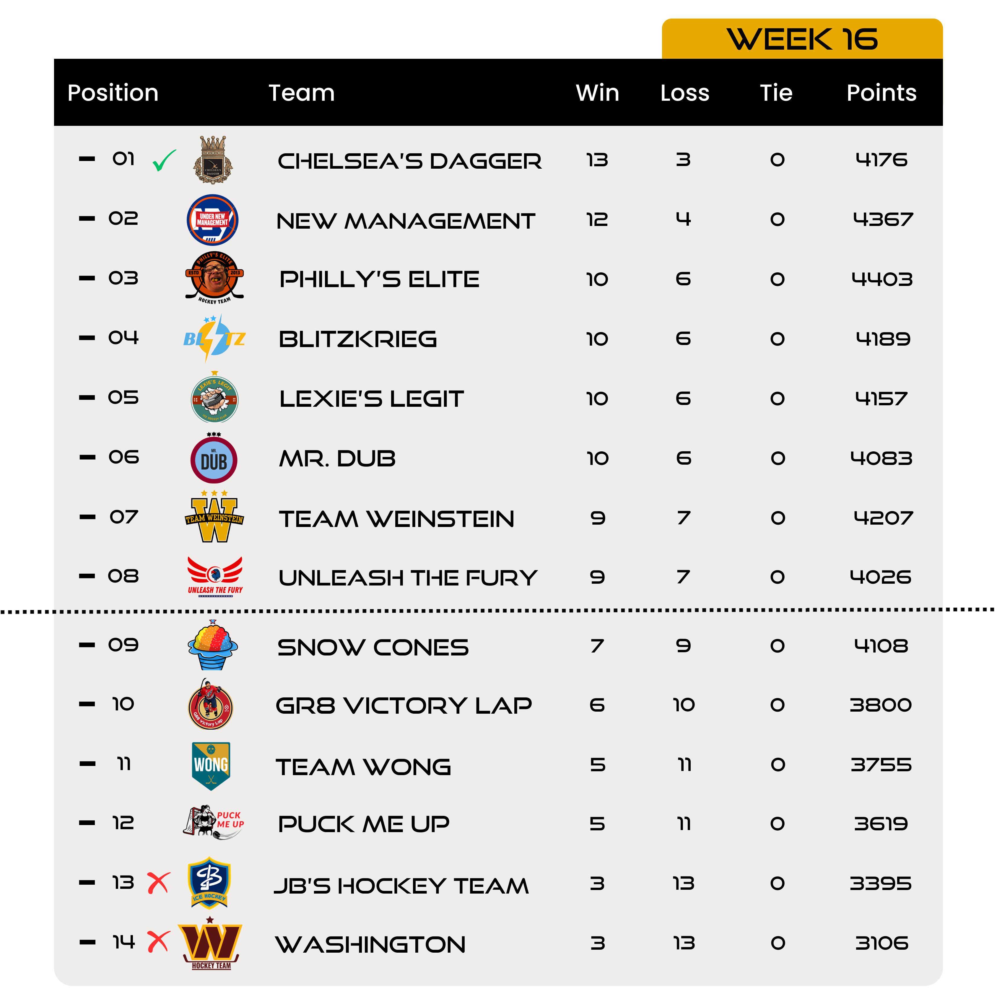 Philly’s Elite and Team Wong destroyed the Washington Hockey Team and JB’s Hockey Team, respectively. With those losses, Henry and Julia are the first two teams to officially be eliminated from playoff contention. Yikes.