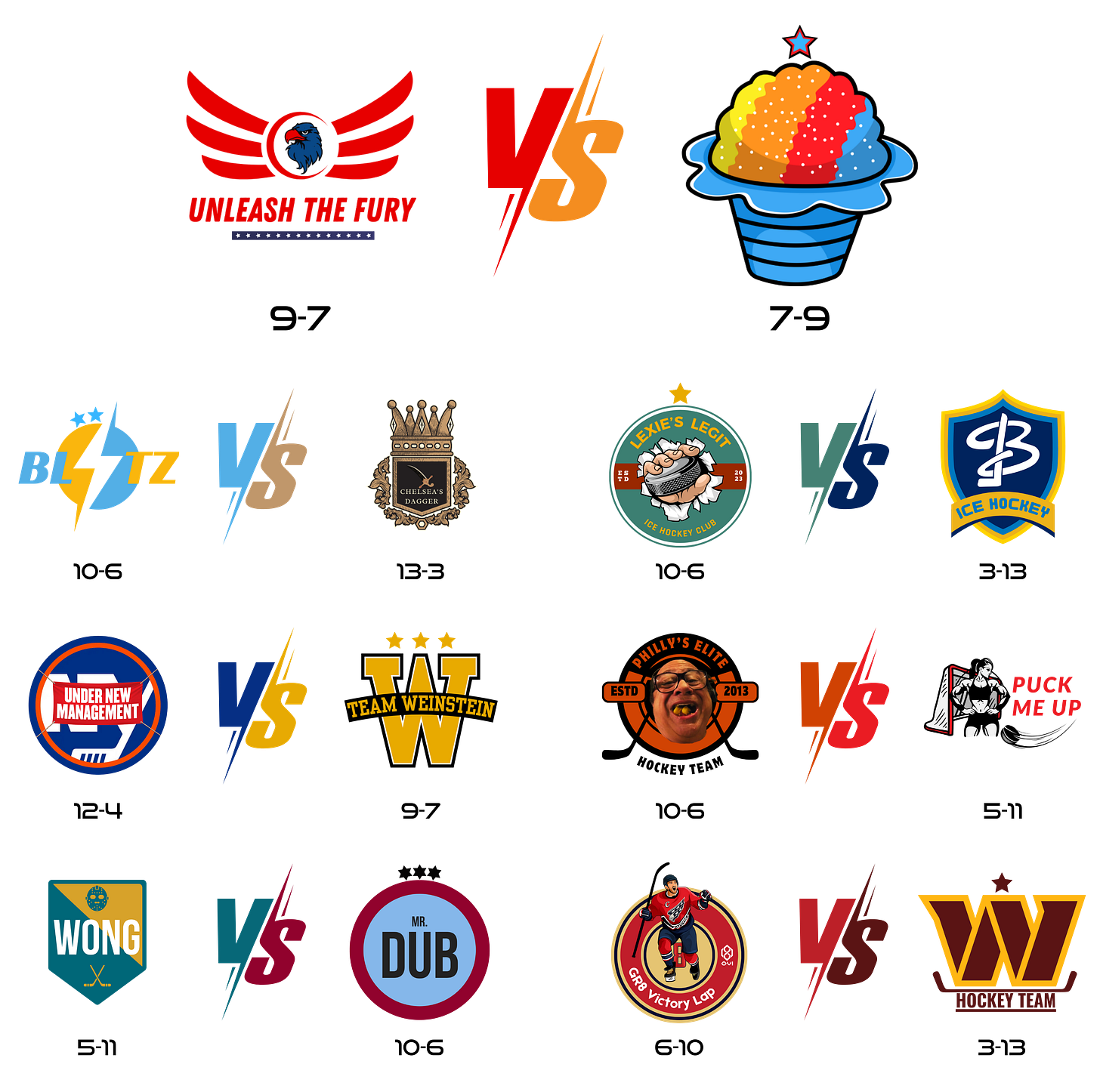 9th place on down all have losing records meaning 8th place Unleash the Fury has a 2-win buffer over the rest of the pack. Snow Cones, Gr8 Victory Lap, Team Wong, and Puck Me Up have to start winning and do so fast. The season’s end is rapidly approaching.