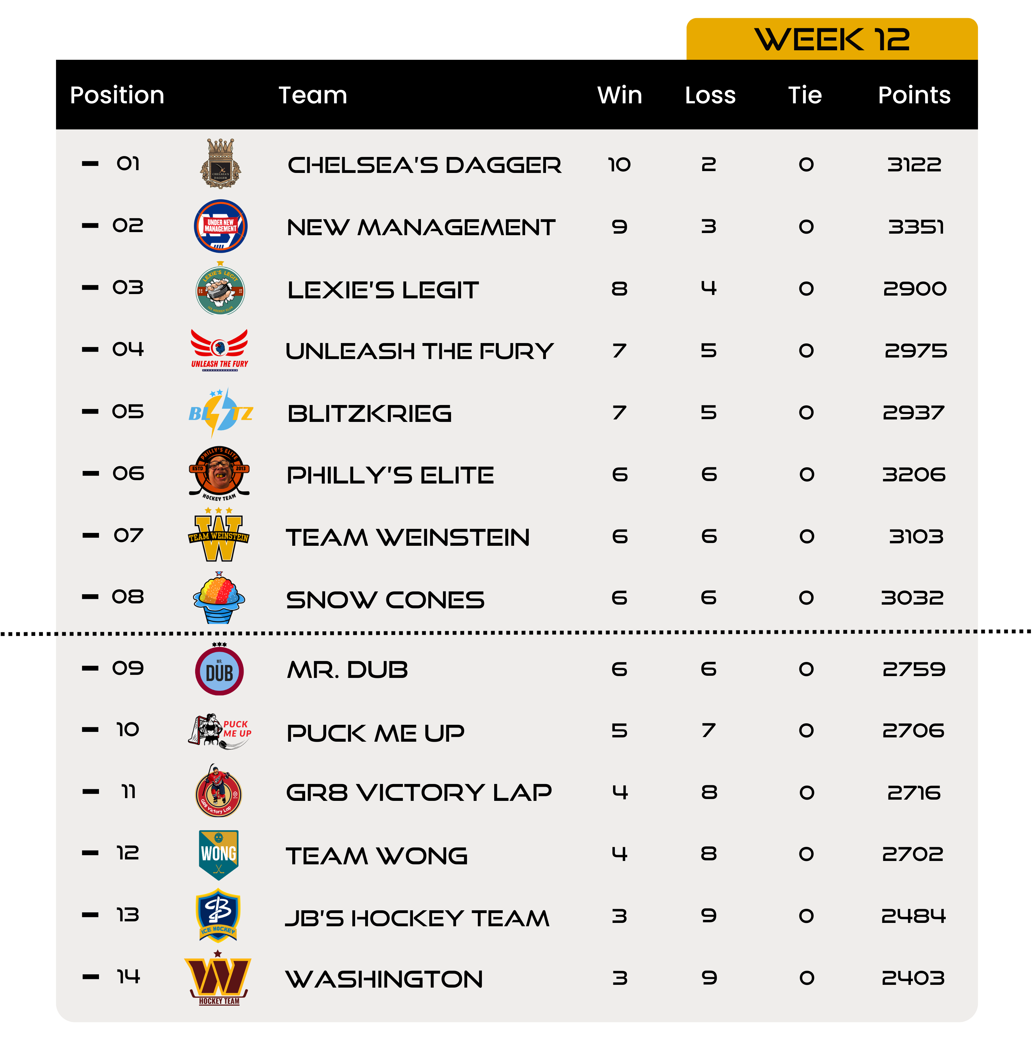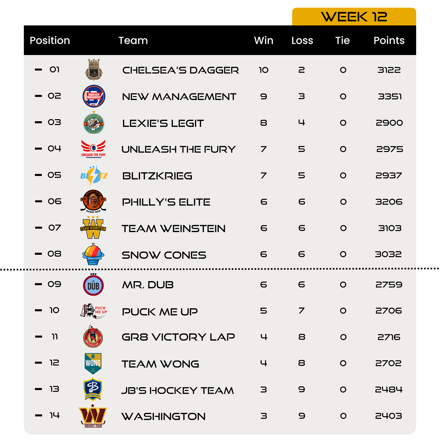 Speaking of drowning, Henry’s Washington Hockey Team has fallen to what has unfortunately become familiar territory in recent seasons. With his week 12 loss to Paige’s Puck Me Up, Hank sits in dead last with a mere 2,403 total points on the season. Dang… that must hit like a Mat Barzal two-hander to the ankles.