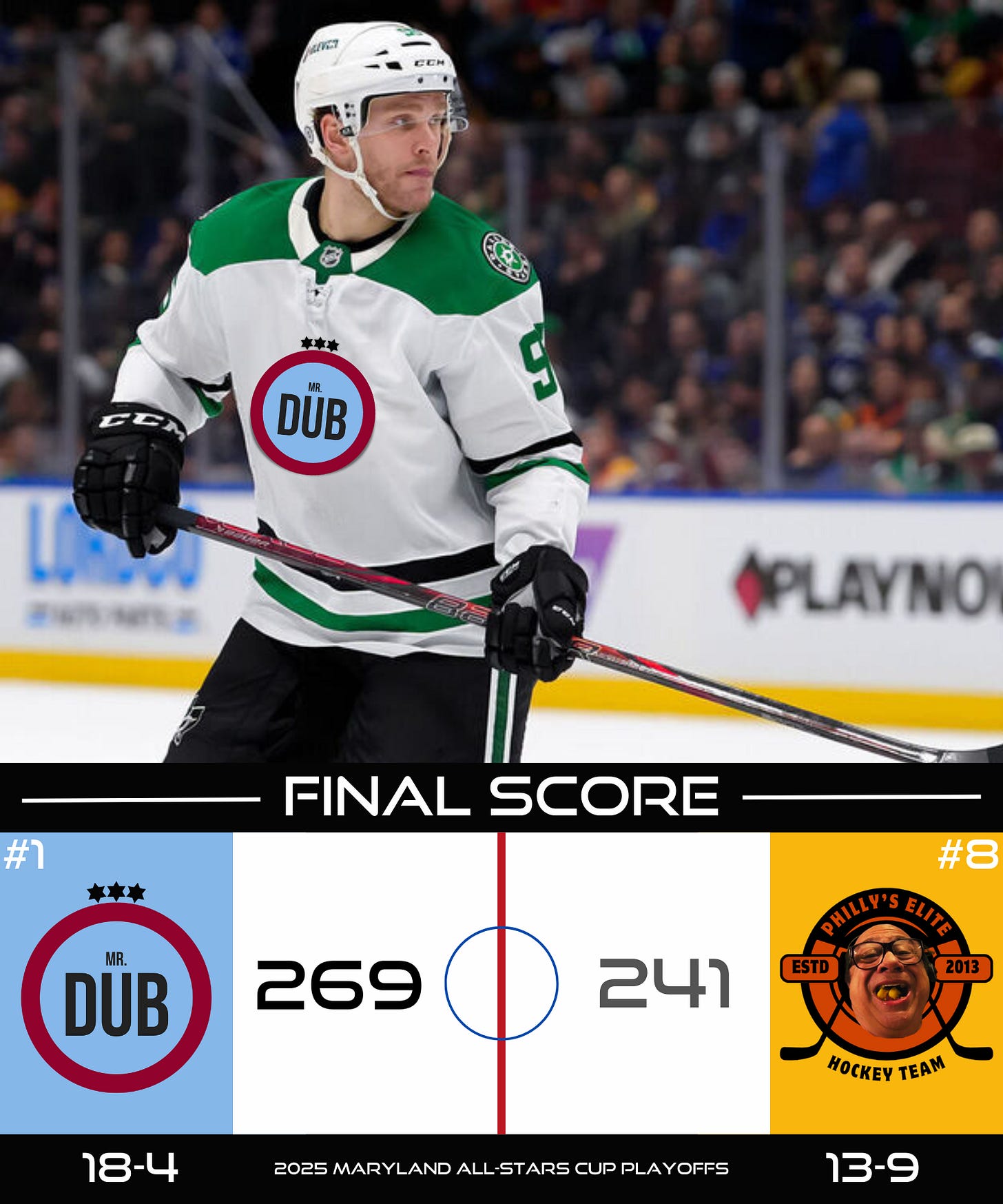 Philly’s Elite trailed Mr. Dub by a mere 5 points going into Sunday and was in prime position for one of the biggest upsets in the history of the Maryland All-Stars Cup Playoffs. #1 seed Mr. Dub had other plans, however. In veteran fashion, he picked up both David Rittich and Ryan Donato early Sunday morning who ended up combing for 19 points and played a huge role in propelling the 3-time champion into the semifinals. It was a hard-fought battle between two veterans of the league and Jordan deserves his flowers for a great season! That elusive first Cup will have to wait for the Philly fanatic.