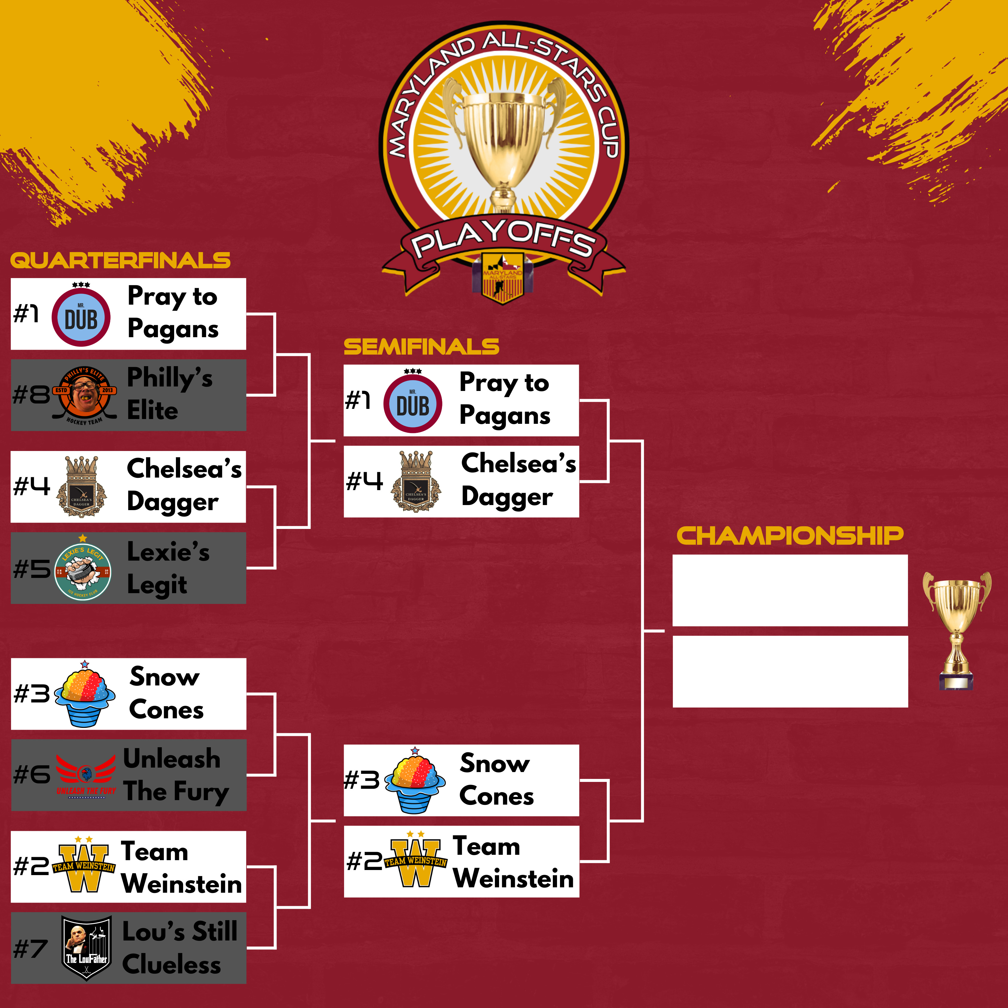 The most dominant team in league history goes up against one of the hottest teams in league history! This semifinals battle should be one for the ages. Mr. Dub won the first matchup between these two this year, but Ian won the rematch. It is only fitting that this season series will be decided in the semifinals. Mr. Dub is gunning for his 4th Maryland All-Stars Cup and Ian is trying for his very 1st. Will the evil empire prevail or will the team of destiny continue to shock the world?!