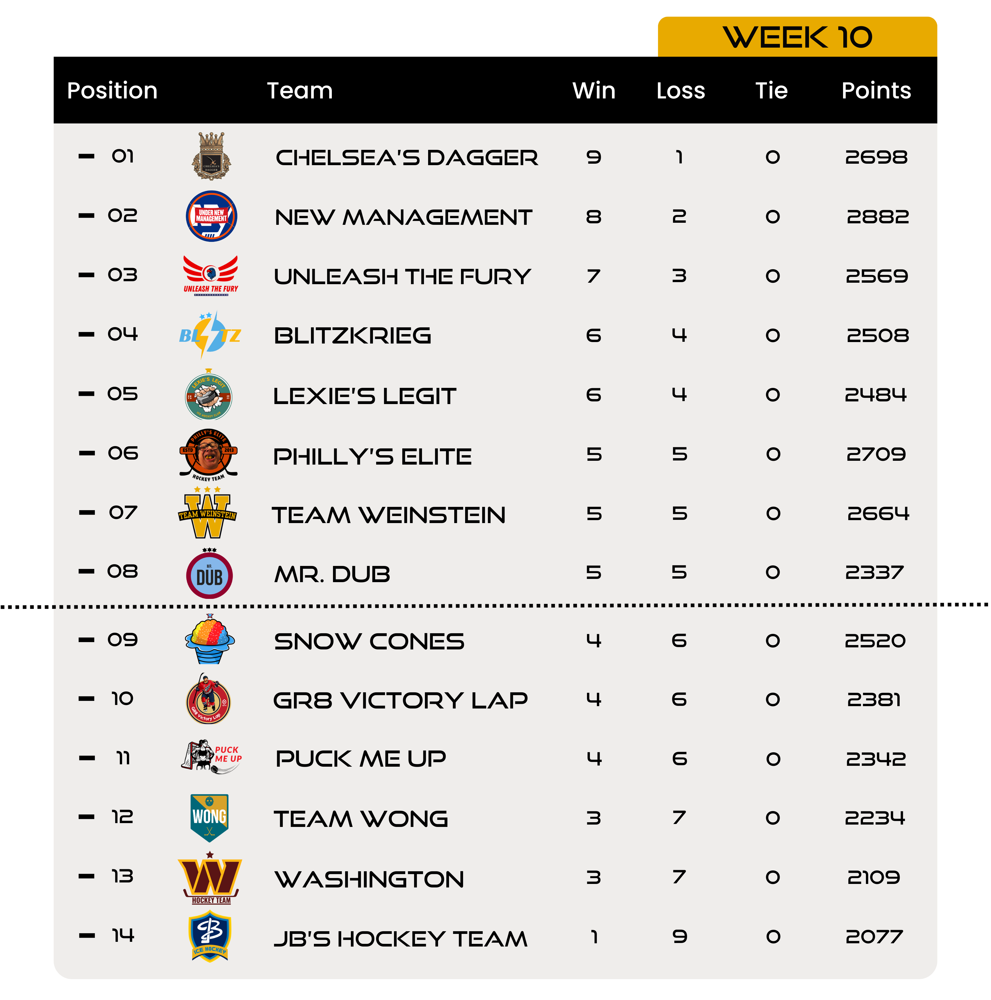 Ian continues his dominant run of form, this time easily dispatching of 3rd-place Unleash the Fury. Closely behind him is Eric’s Under New Management, who has won 5 in a row to keep the pressure on Ian. Lexie also took care of business against a struggling Washington Hockey Team. With that defeat, Henry finds himself in 13th place, a season-worst for the club.