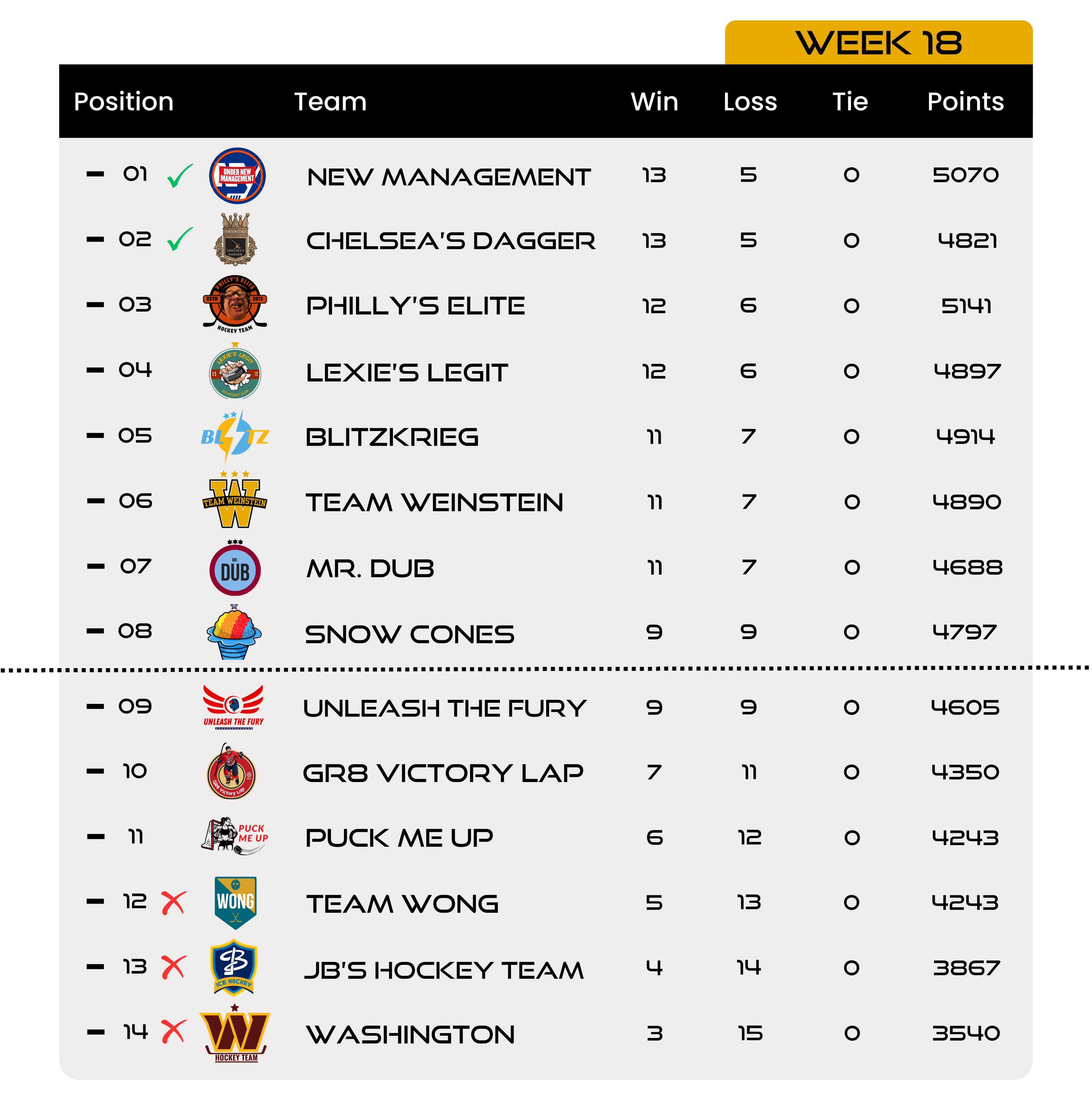 With 3 weeks in the regular season remaining, Unleash the Fury, Gr8 Victory Lap, and Puck Me Up face a near-impossible challenge to end up on the right side the line. We will have more eliminations by this time next week. It’s crunch time!