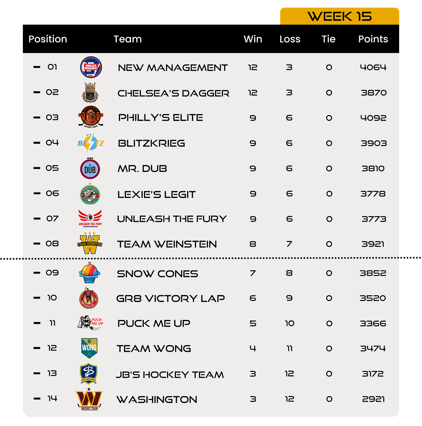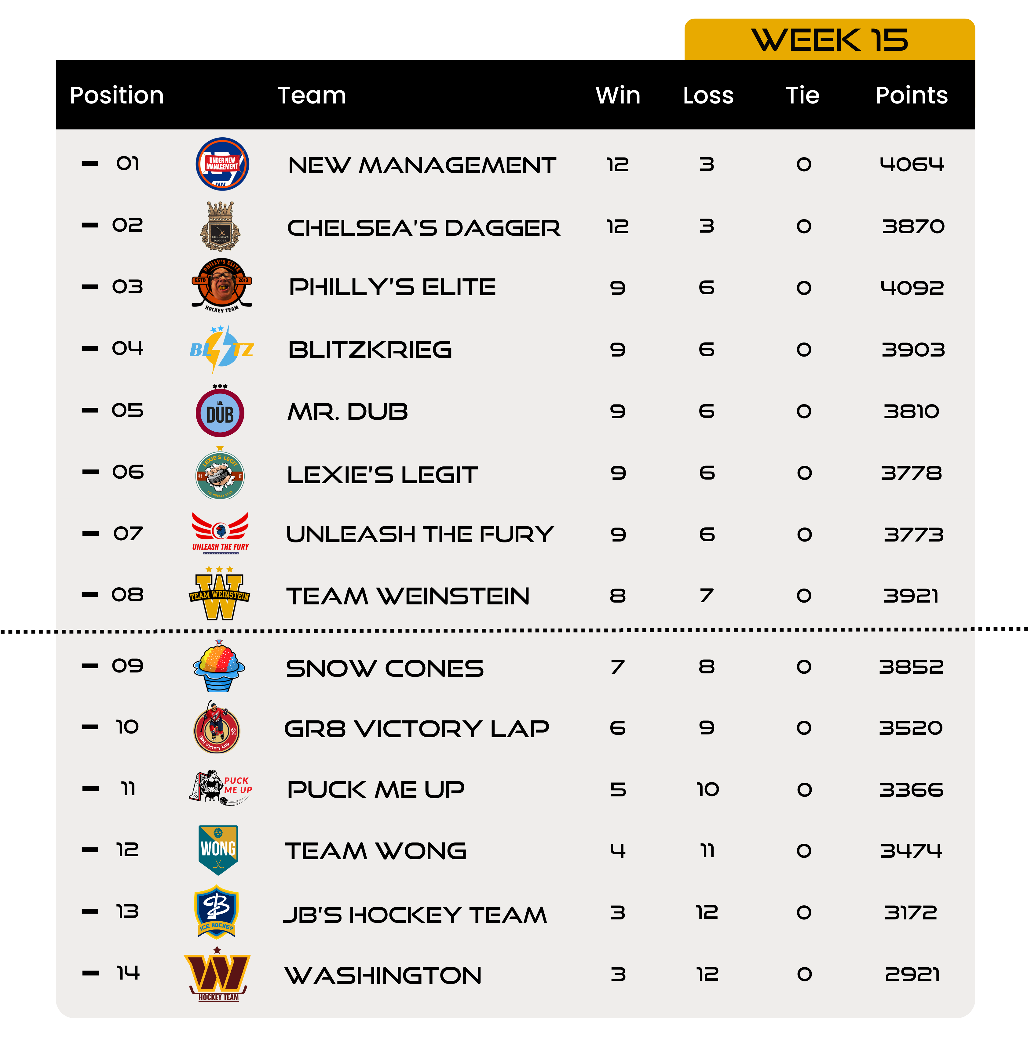 Here are the full standings after 15 weeks of play: