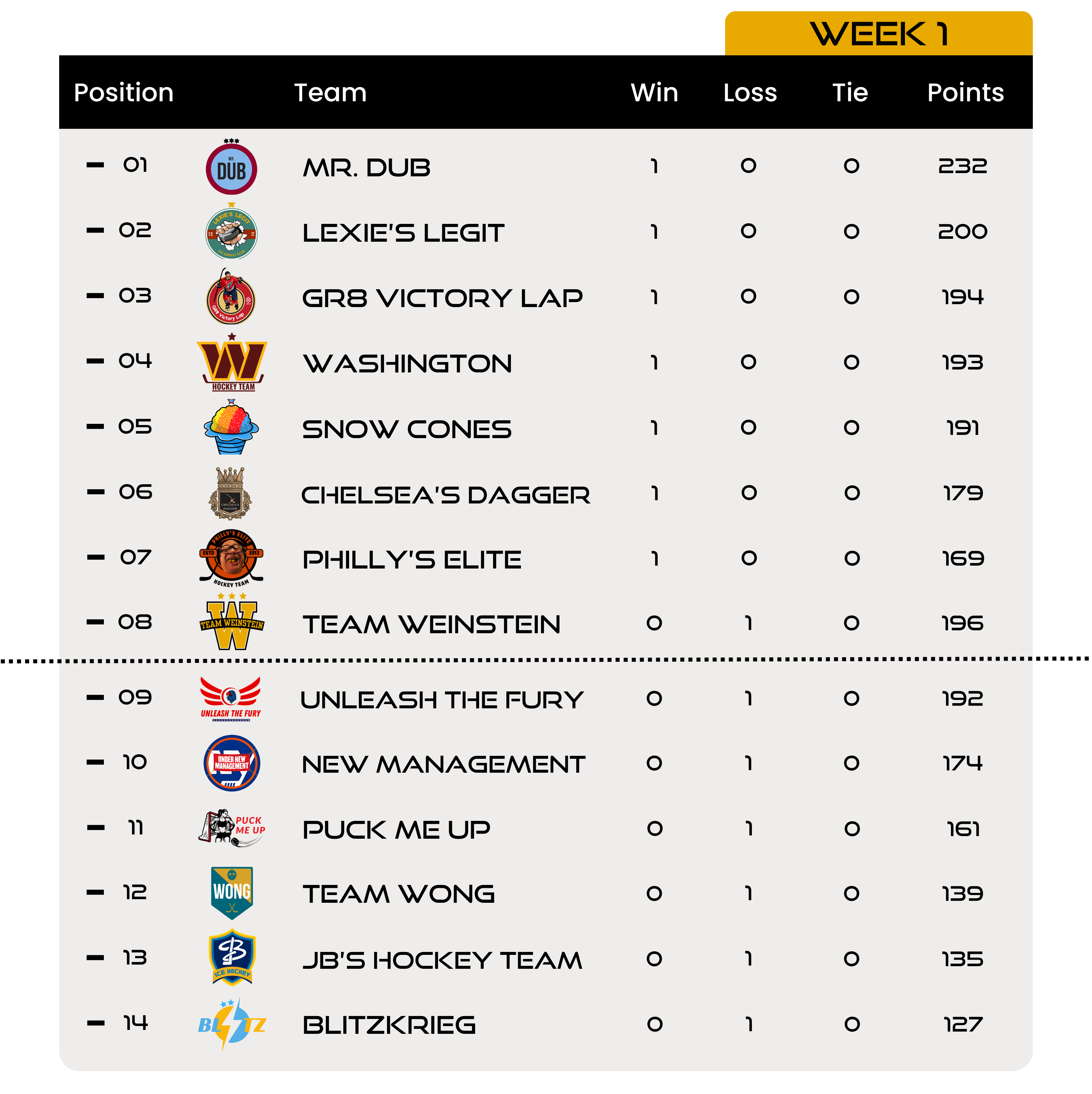 Jordan’s Philly’s Elite, Snow Cones, and Ian’s Chelsea’s Dagger also won their week 1 matchups and look to build on their strong finishes to 2024-25, which saw each of their teams make the playoffs.