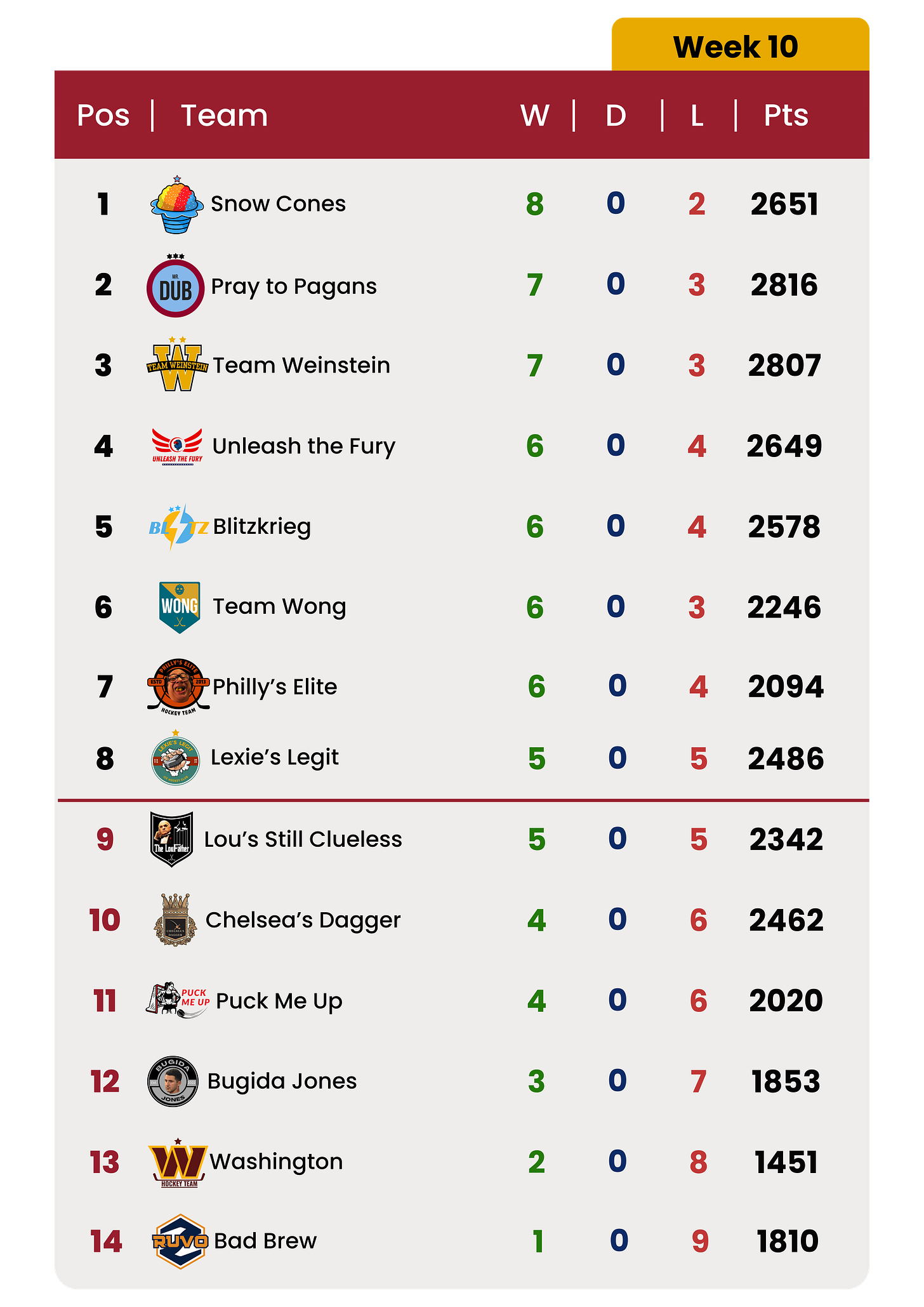 Here are the full standings after ten weeks of play: