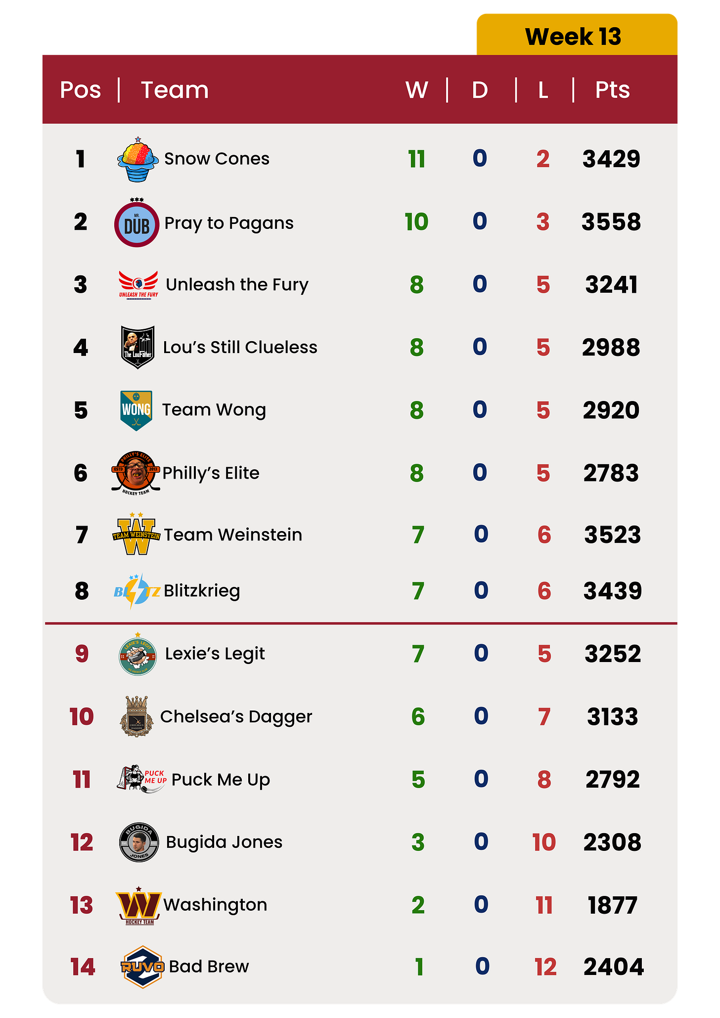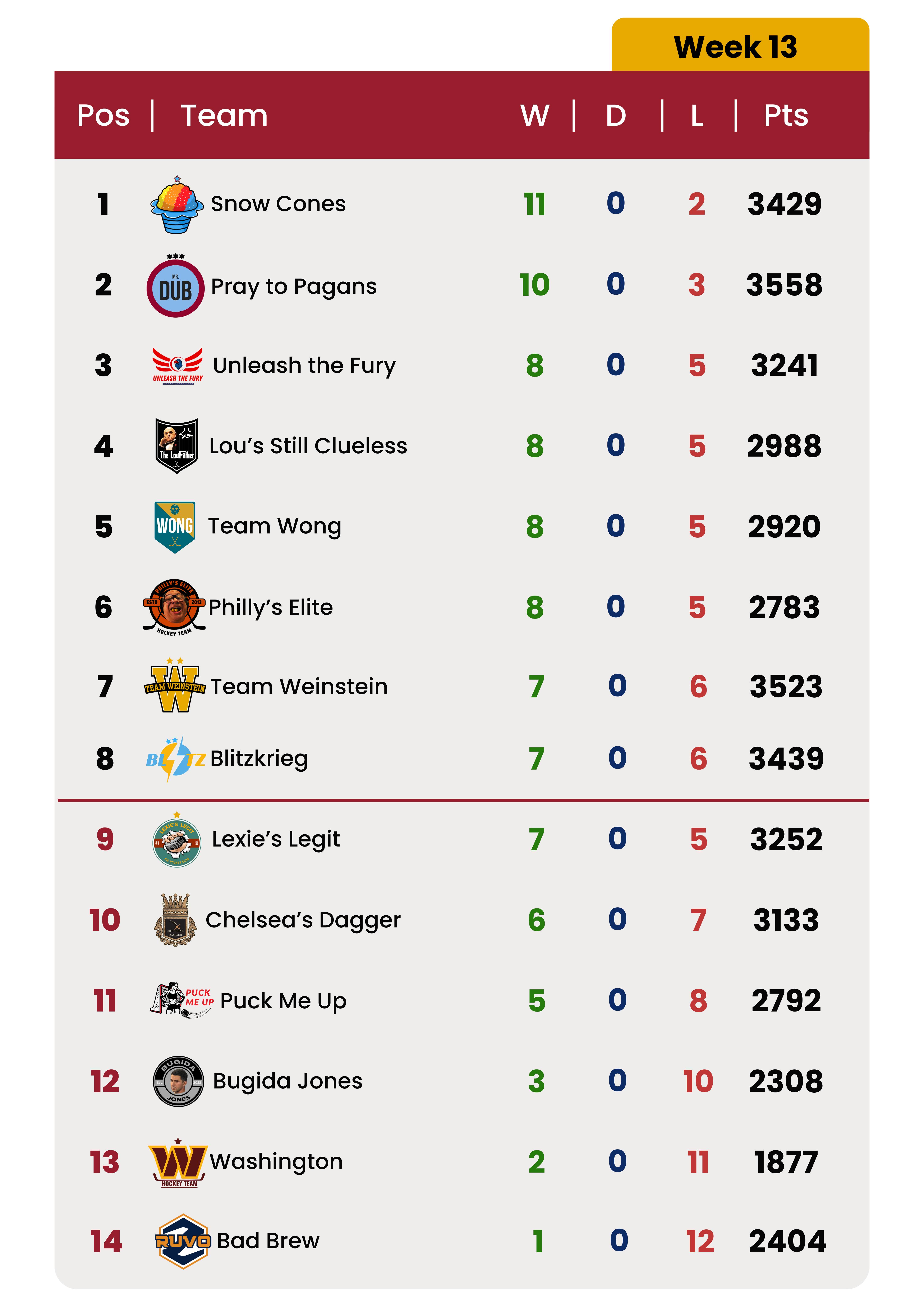 Puck Me Up lost a narrow one to Lou’s Still Clueless and is only 2 wins out from the playoff positions. A lot can change in 9 weeks!