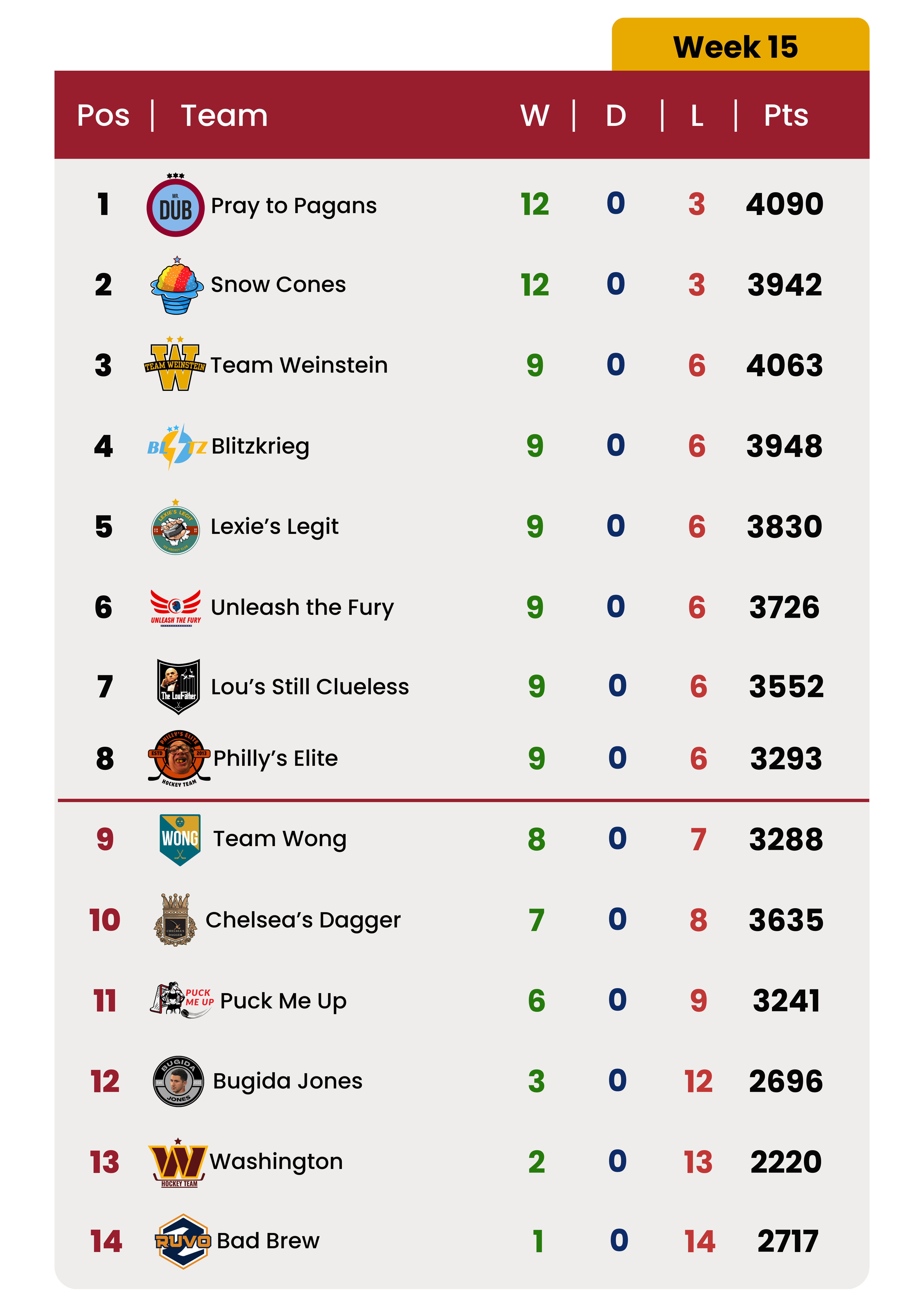 Here are the full standings after 15 weeks of play: