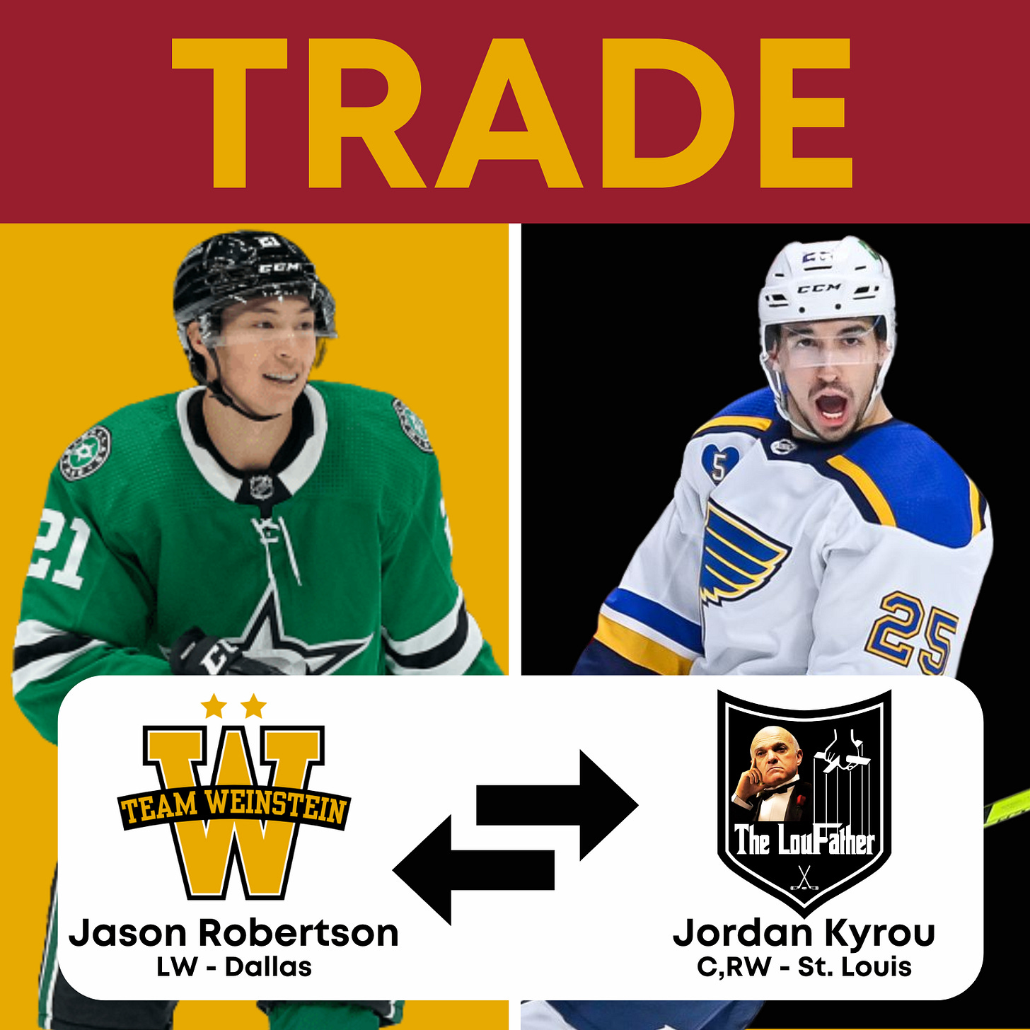 Team Weinstein and Lou’s Still Clueless have agreed to trade St. Louis Blues C,RW Jordan Kyrou in exchange for Dallas Stars LW Jason Robertson.