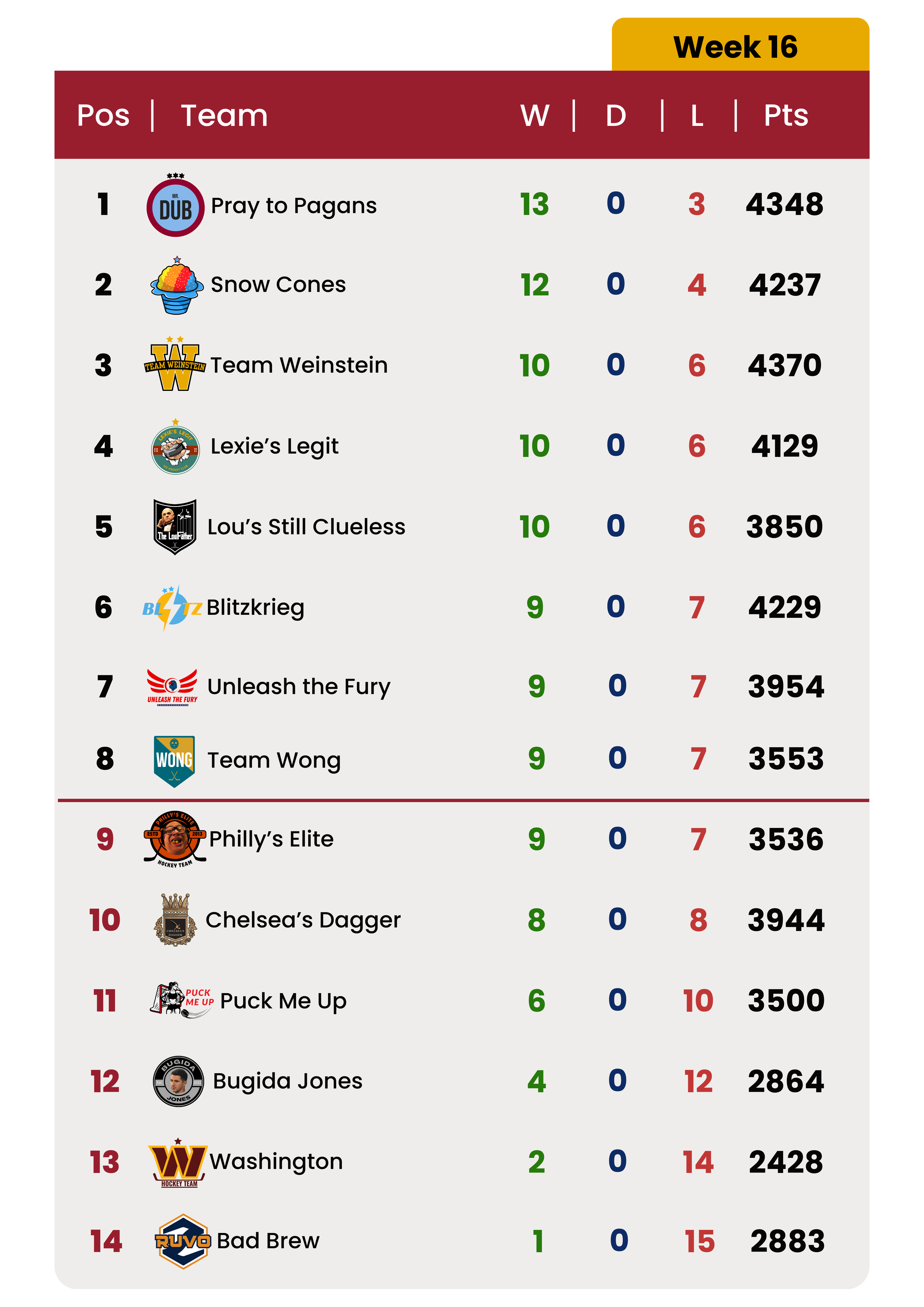 Here are the full standings after 16 weeks of play: