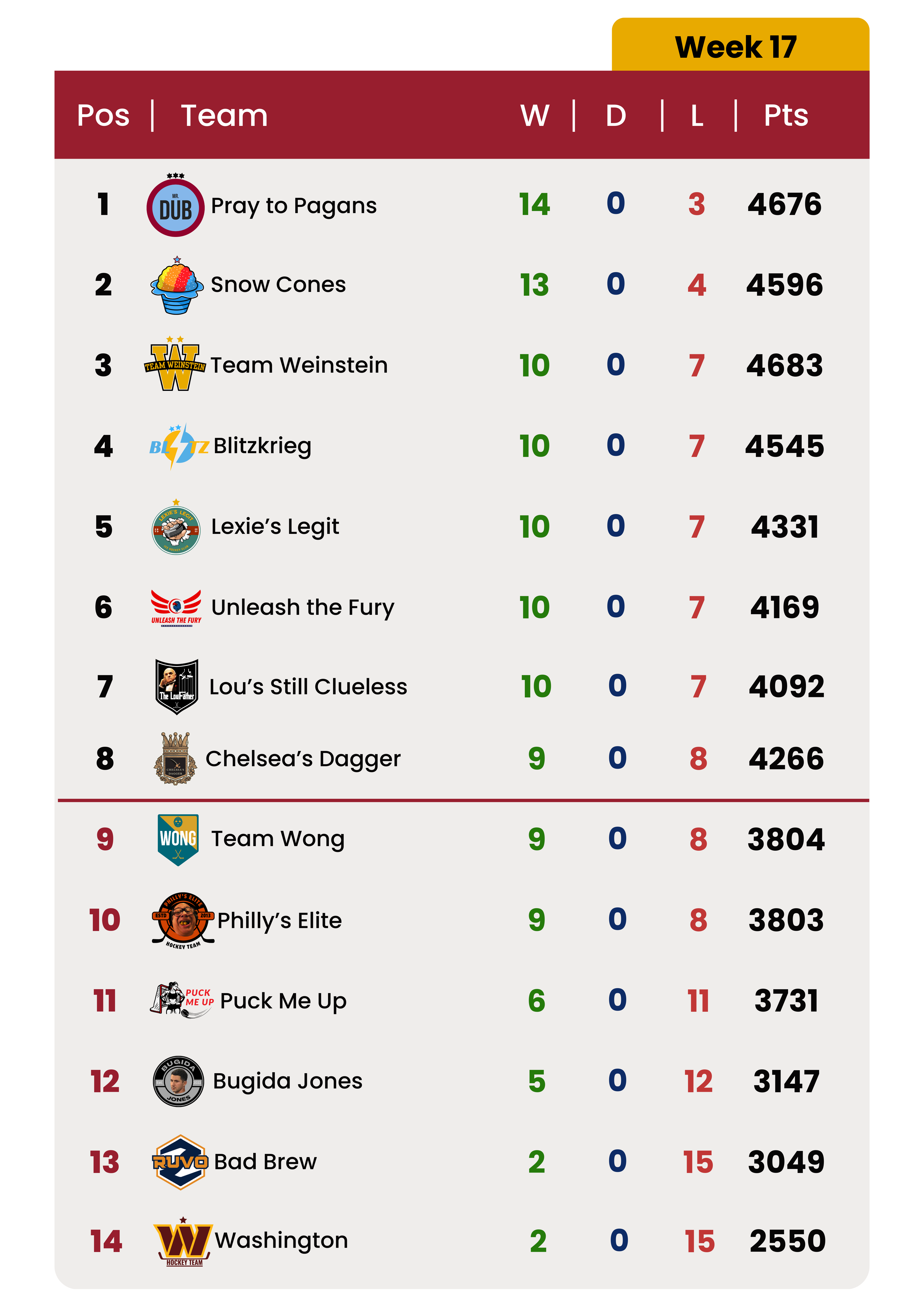 Mr. Dub extends his win streak to 7-straight, a league best this season, and remains atop the table with .824 winning percentage. His win was highlighted by a 117 point Monday night that essentially locked out Puck Me Up from mounting any type of formidable comeback over the course of the week. Mr. Dub will be one of the team’s to beat in the playoffs as he sets out for Cup number 4! Paige’s loss was a devastating one, as she now sits 3-wins back of 10th place with only 5-weeks to play. Her playoffs hopes are quickly fading.