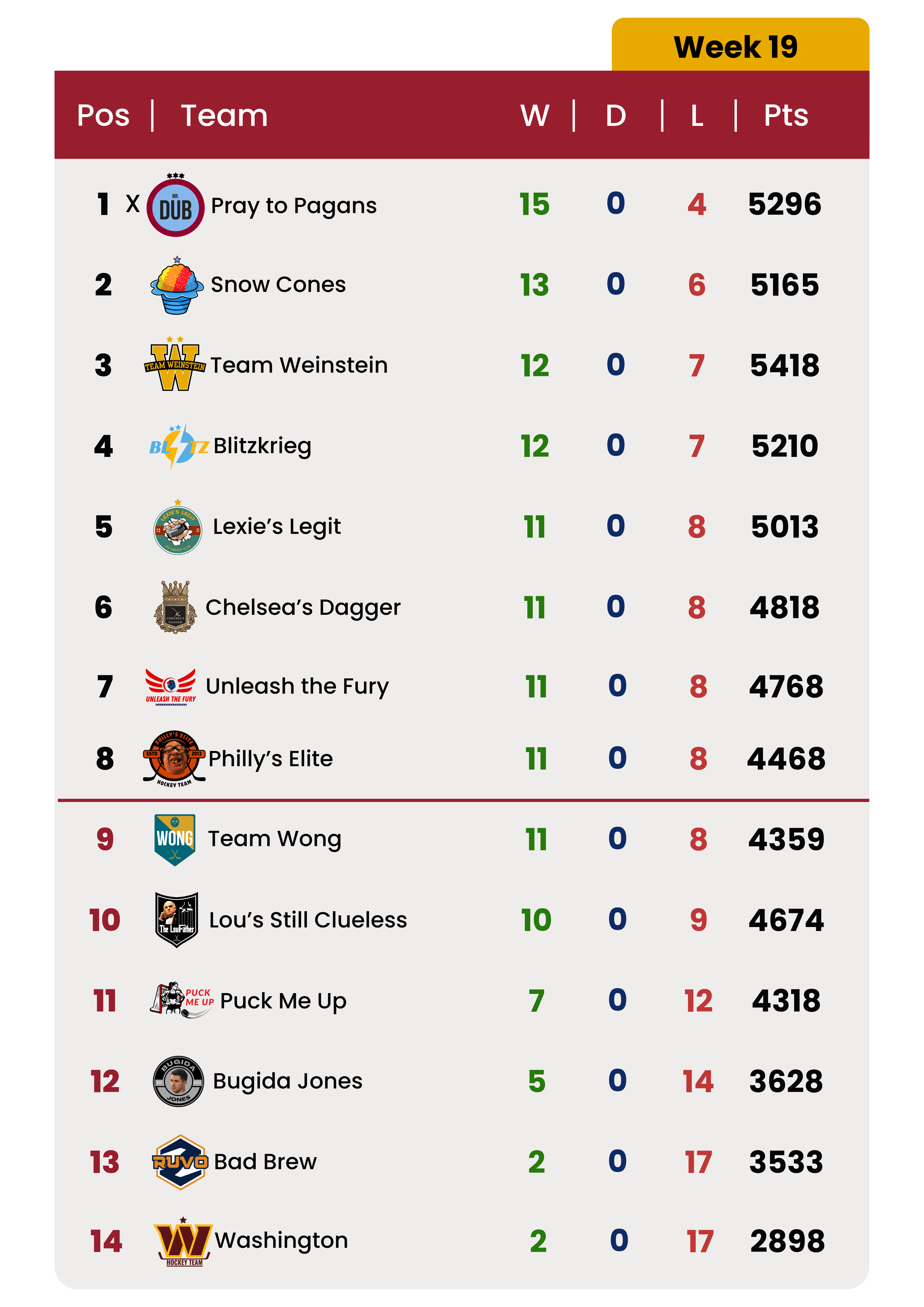 Here are the full standings after 19 weeks of play: