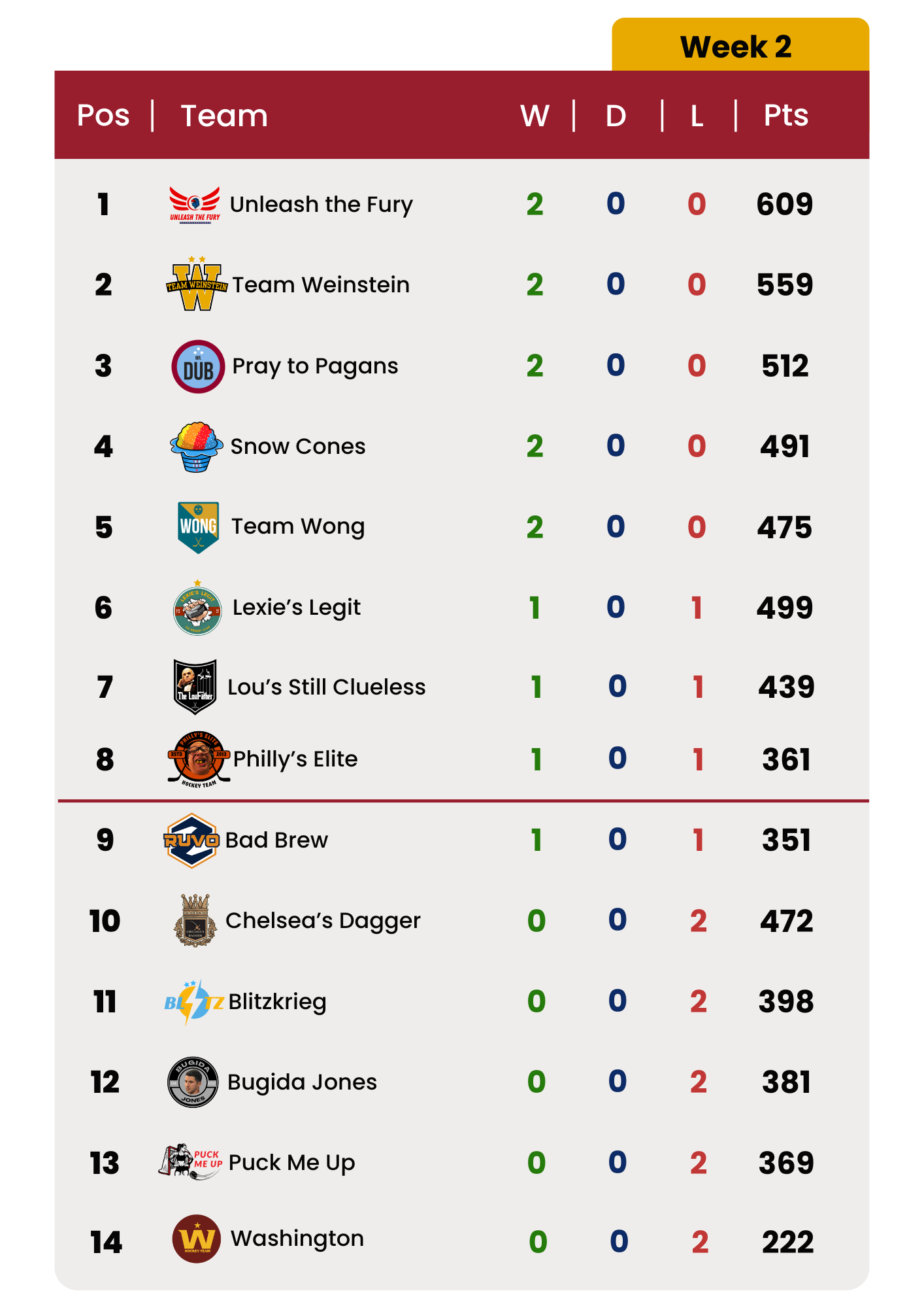 Here are the full standings after two weeks of play: