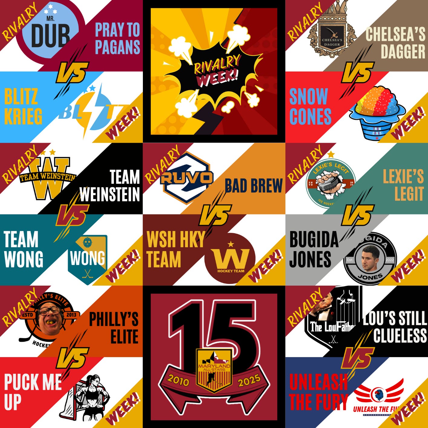 Ian’s longtime feud with Snow Cones renews, Mark and Kendall duke it out yet again, old time friends Zach and Henry come head to head, expansion teams Lexie and Joe fight for supremacy, Jordan and Paige face off in the Richard Montgomery derby, and title contenders Eric and Katelyn battle it out for bragging rights.