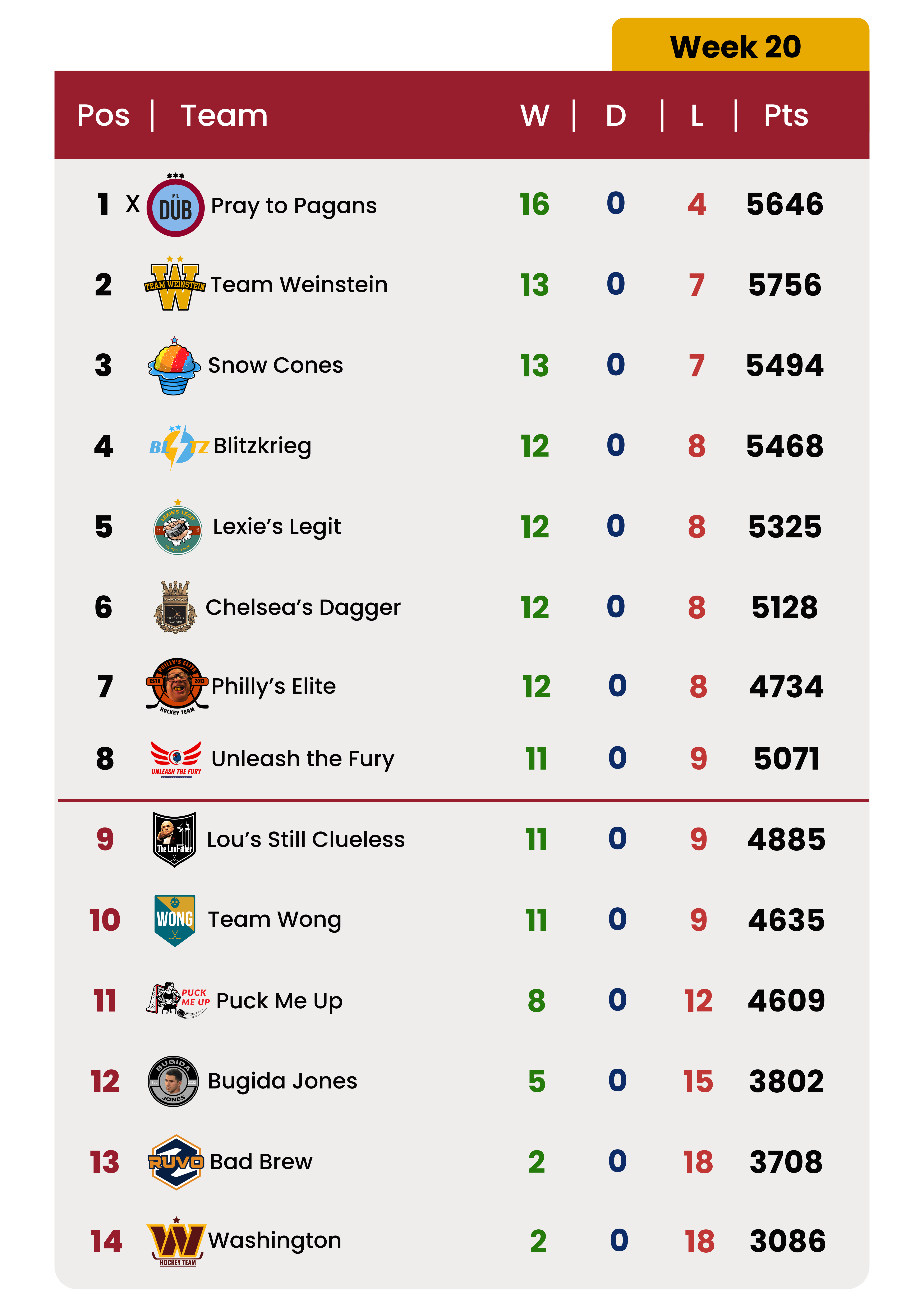 Lou’s Still Clueless snapped his 3-week losing streak, but losses in 4 of his last 6 leave him on the outside looking in. Team Wong also suffered a devastating defeat against Chelsea’s Dagger leaving him in 10th place. To make things even more dramatic, Eric and Kendall face off this week in the most important matchup of the season! Winner stays alive, loser is likely done. Get ready, folks!