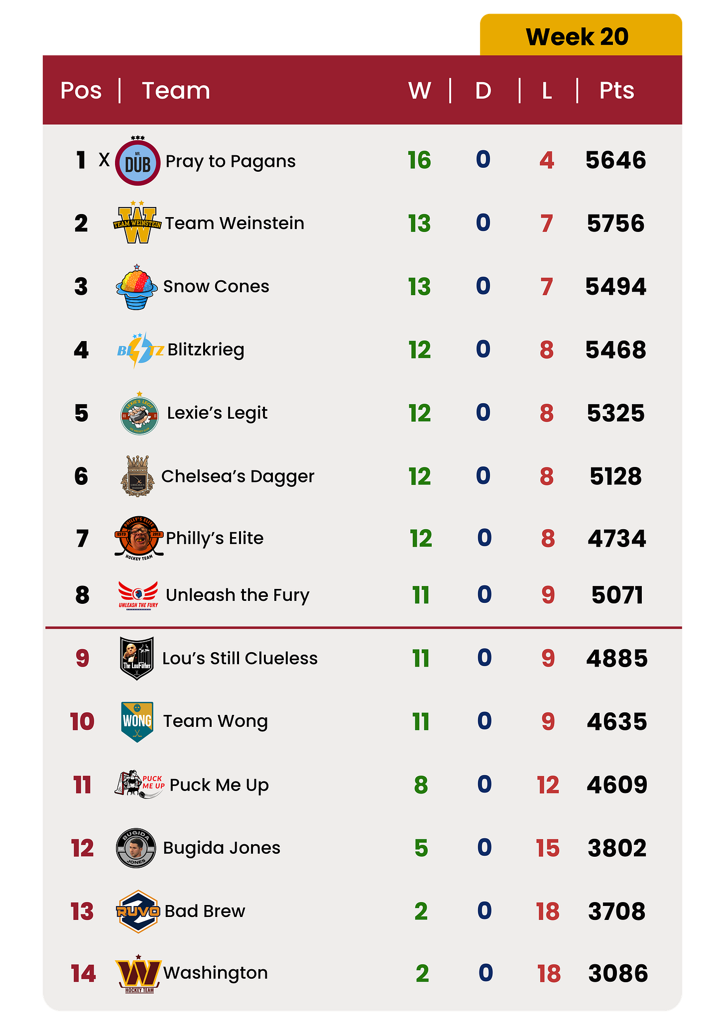 The Weinstein’s had yet another dominant week. Mr. Dub scored 349 points to make it 16 wins on the year and clinch the Montgomery Trophy for finishing in 1st place in the regular season! This is Mr. Dub’s 4th Montgomery Trophy and his first since 2013/14. Congratulations! Team Weinstein defeated Snow Cones by 10 points to take over 2nd place from the Swiss machine. Huge performances from Jake Guentzel and Jason Robertson brought it home for Mark. I think it is safe to say he won the trade. He is also closing in on the Gordon Bombay Trophy, awarded to the team with the highest point total in the regular season. With only two weeks remaining, it is looking all the more likely Mark will be taking home his 5th Gordon Bombay and 3rd consecutive.