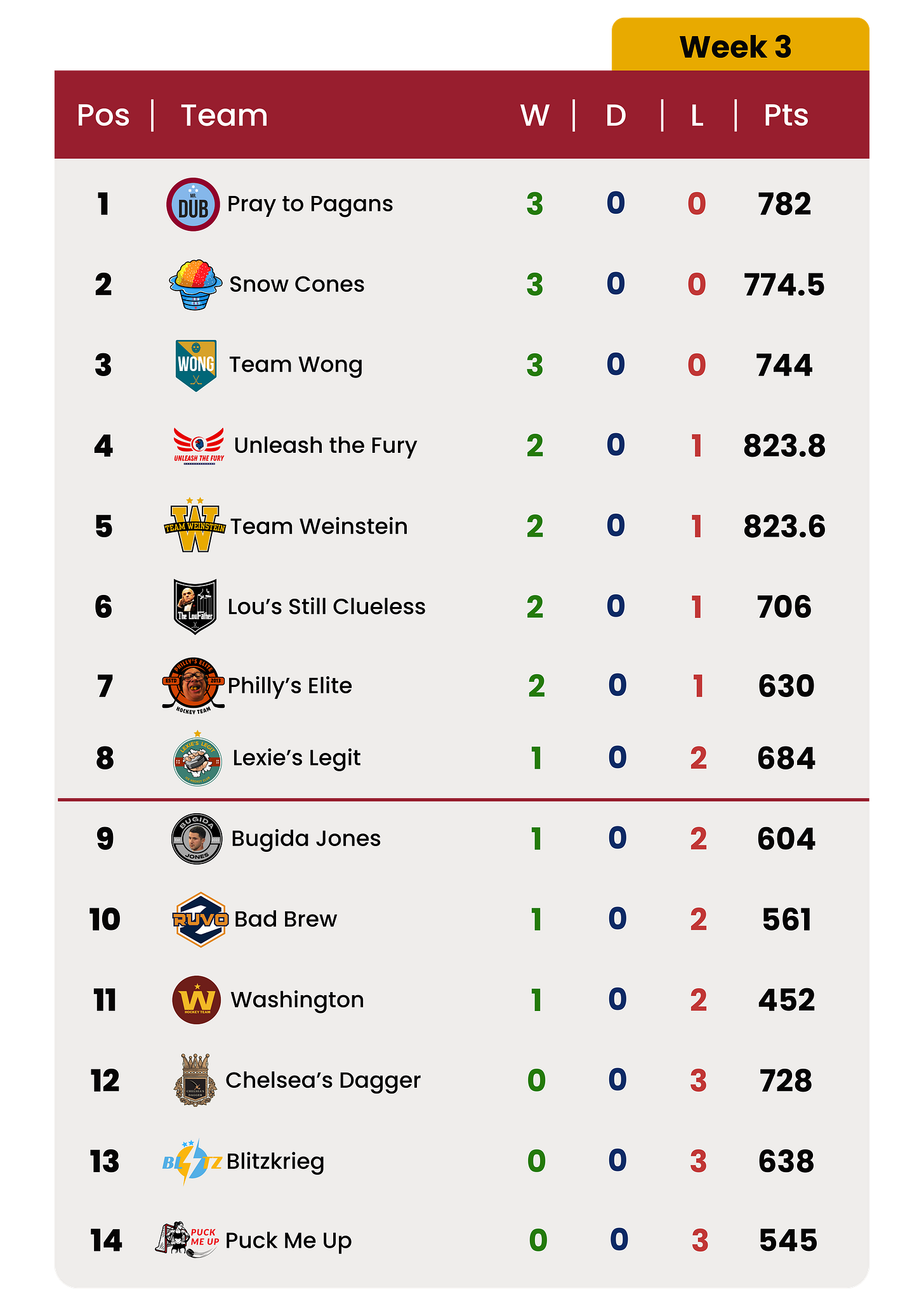 Here are the full standings after two weeks of play: