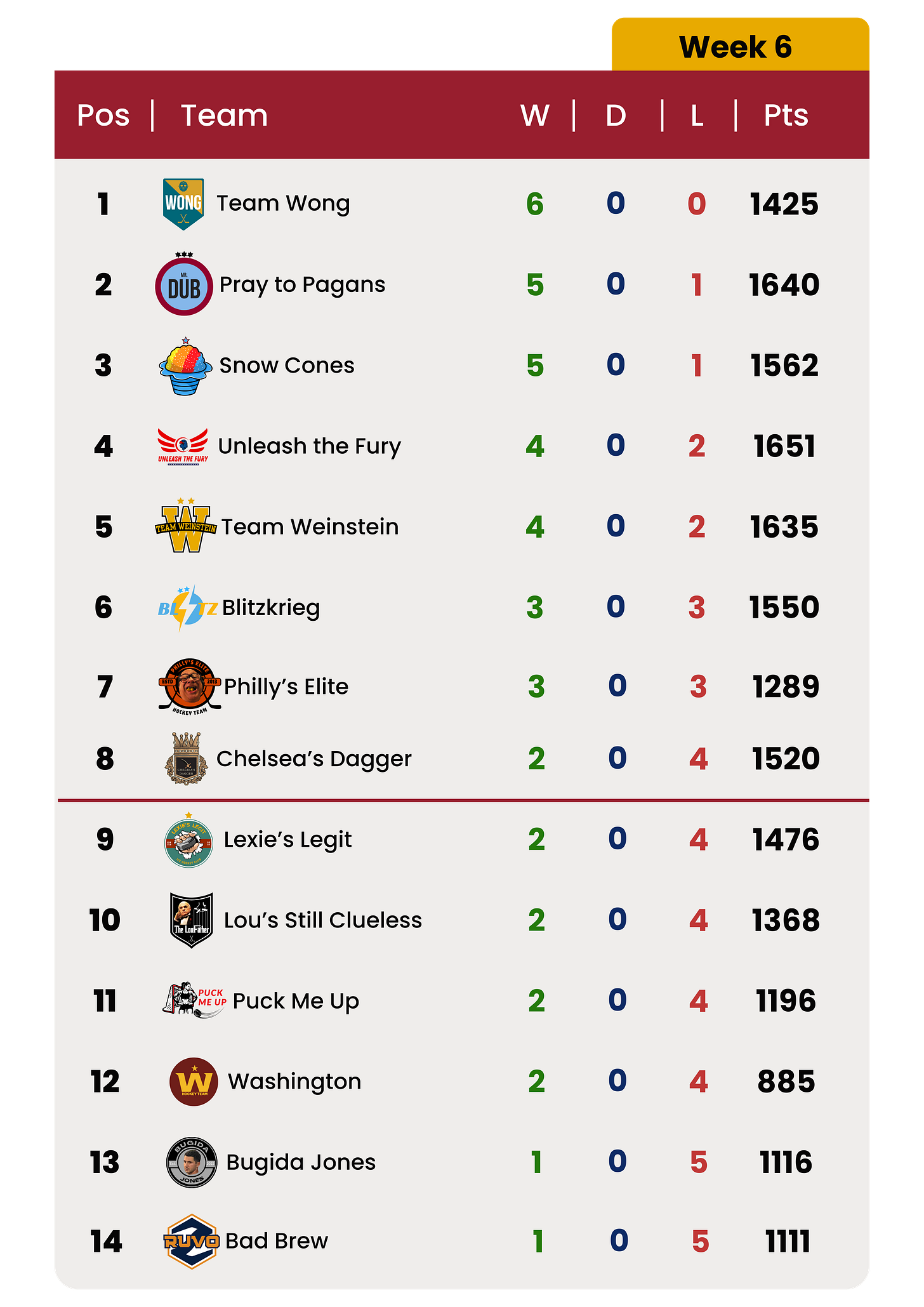 Week 6: WWWWWWong Stays Unbeaten as Mr. Dub and Snow Cones Soar